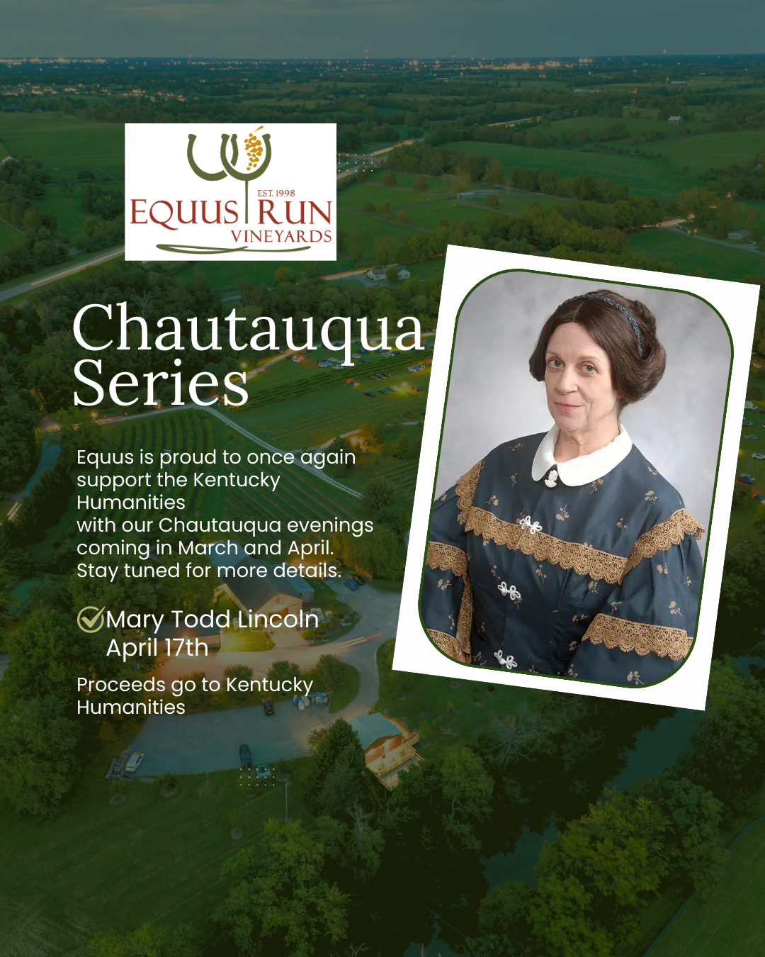 Chautauqua Theater – Compelling Storytelling Our 2026 Chautauqua Evenings conclude with Mary Todd Lincoln, Friday, April 17th. Born in Lexington and raised with uncommon education and ambition, Mary Todd Lincoln was one of the most fascinating and influential women of her time. Equus Run Vineyards is proud to once again welcome and support the Kentucky Humanities with our 2026 […]